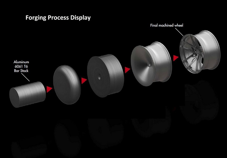 With Aluminum bar A061-T6, we will do firstly cutting for aluminum bar, secondly forging, spinning the rims, CNC machine to wheel design, then painting, finally can be packed and send out.